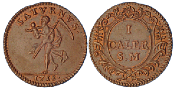 Nödmynt, 1 daler från 1718 "Saturnus"
