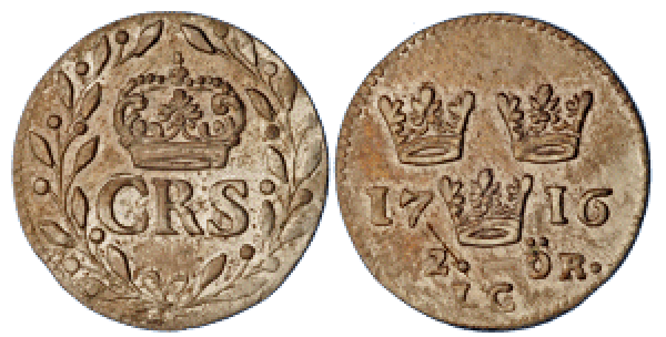 År 1715 började nödmynten präglas. Karl XII:s krig kostade en massa pengar och tärde på statskassan, vilket var orsaken till att nödmynten gavs ut. Det gavs ut över 40 miljoner stycken. Nödmynten försågs med olika inskrifter som till exempel "Kronan", "Flink och färdig" och "Saturnus".